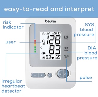 The Beurer BM26 Upper Arm Blood Pressure Monitor with large cuff can help to ease your worries and stay on top of your health at home. Take responsibility for your heart health with our professional-grade, fully automatic blood pressure and pulse monitor, for the upper arm. We want to encourage you to make your health a priority, which is why our Blood Pressure Monitor Set includes a storage case, so that you can take your monitor anywhere - even on vacation. Enjoy the quality and precision of German-engineering with the BM26 Blood Pressure Machine that even detects irregular heartbeat, which can signal possible heart problems allowing you to alert your doctor. The monitor also allows you to easily interpret your measurement using a color risk indicator, which is based on the metrics from WHO (World Health Organization). The large LCD screen displays the time and the date and gives you an incorrect usage message if there is something in error. Having a home monitor is important for managing and taking preventative measures for high blood pressure, also known as hypertension.