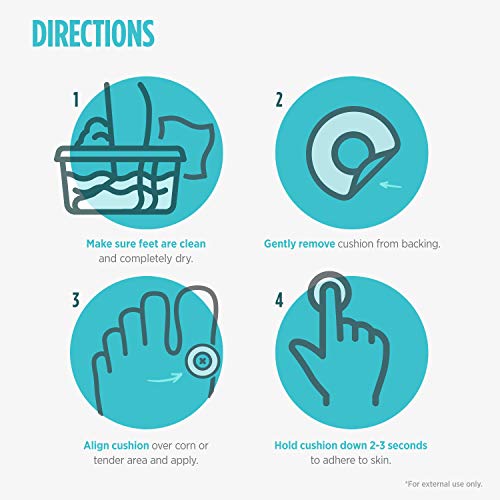 Easy to Apply - Make sure feet area is clean and dry; Gently remove cushion from backing; Align cushion with hole over corn or tender area and apply; Hold down for 2-3 seconds to adhere; Repeat daily as needed