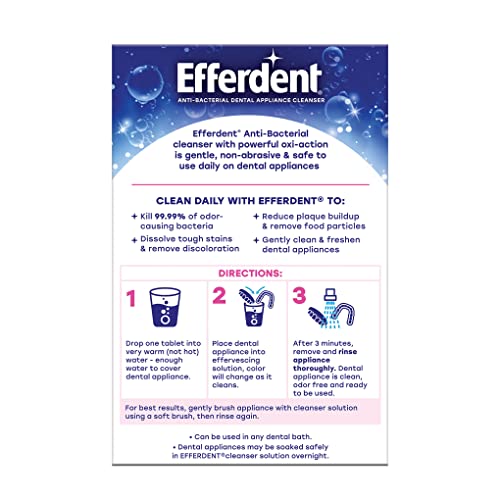 Efferdent retainer cleaner tablets fight plaque build-up and kill odor-causing bacteria leaving dental appliances fresh and ready-to-use